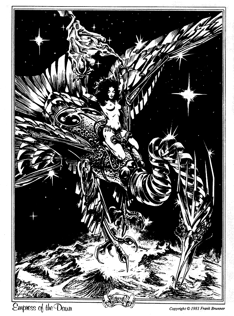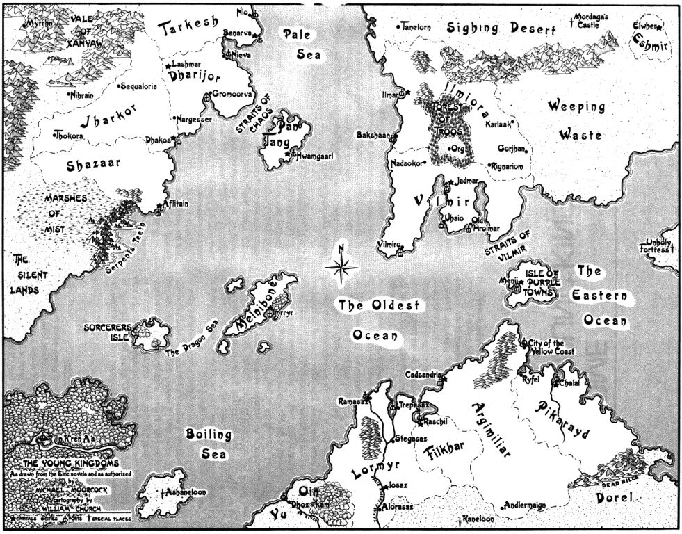 L’universo di Stormbringer, come accennato nell’introduzione, è un universo dalle tinte fosche dove gli uomini combattono contro il destino avverso e molte volte già segnato dai disegni delle divinità. Lo stesso mondo è segnato dall’intervento delle divinità, alcuni campioni come Aubec o lo stesso Elric, vedono il loro destino e le loro fortune ai loro patroni superni, gli dei della Legge per Aubec e il Signore delle sette tenebre Arioch nel caso di Elric. Il mondo dei Regni giovani si presenta diviso in quattro grandi continenti intorno al grande Oceano centrale dove emergono delle solitarie isole popolate da alcune frale più potenti civiltà dei Regni come ad esempio Pan Tang o Melnibonè. I continenti principali sono divisi in varie nazioni, qualche volte più simili alle città stato che a vere proprie nazioni, che convivono tra lotte per il potere e trattati commerciali, mentre la chiesa del Caos, soprattutto grazie al poter sempre crescente dalla città di Pan Tang, residenza del Teocrate autoproclamatosi capo della chiesa del Caos, si diffonde per portare la voce delle sue divinità in tutto il mondo oscurando la luce dell’ordine che le divinità della Legge perseguono. Le avventure dei nostri eroi possono essere ambientati in base alle scelte del Master, le possibilità sono molteplici, in particolare le descrizioni portate nel regolamento sono riferite all’era dopo il sacco di Imrryr da Mappaparte di Elric e Smiogan, che per inciso è quella meglio descritta anche nei romanzi di Moorcock, oppure in un’età precedente dove l’Impero Melniboneano, o Impero Fulgido, regnava similmente all’Impero Romano. Un altro aspetto affascinante che si può approfondire è l’idea dei multiversi, Moorcock ipotizza che vi siano vari universi paralleli in cui le forze del Caos e della Legge si combattono e quello di Elric è solo uno dei possibili che si possono visitare, in alcuni romanzi sono accennati tali viaggi ed ipotizzati eroi simili a Elric e che condividono un destino tragico come il suo, depositari dei destini degli universi da loro abitati.