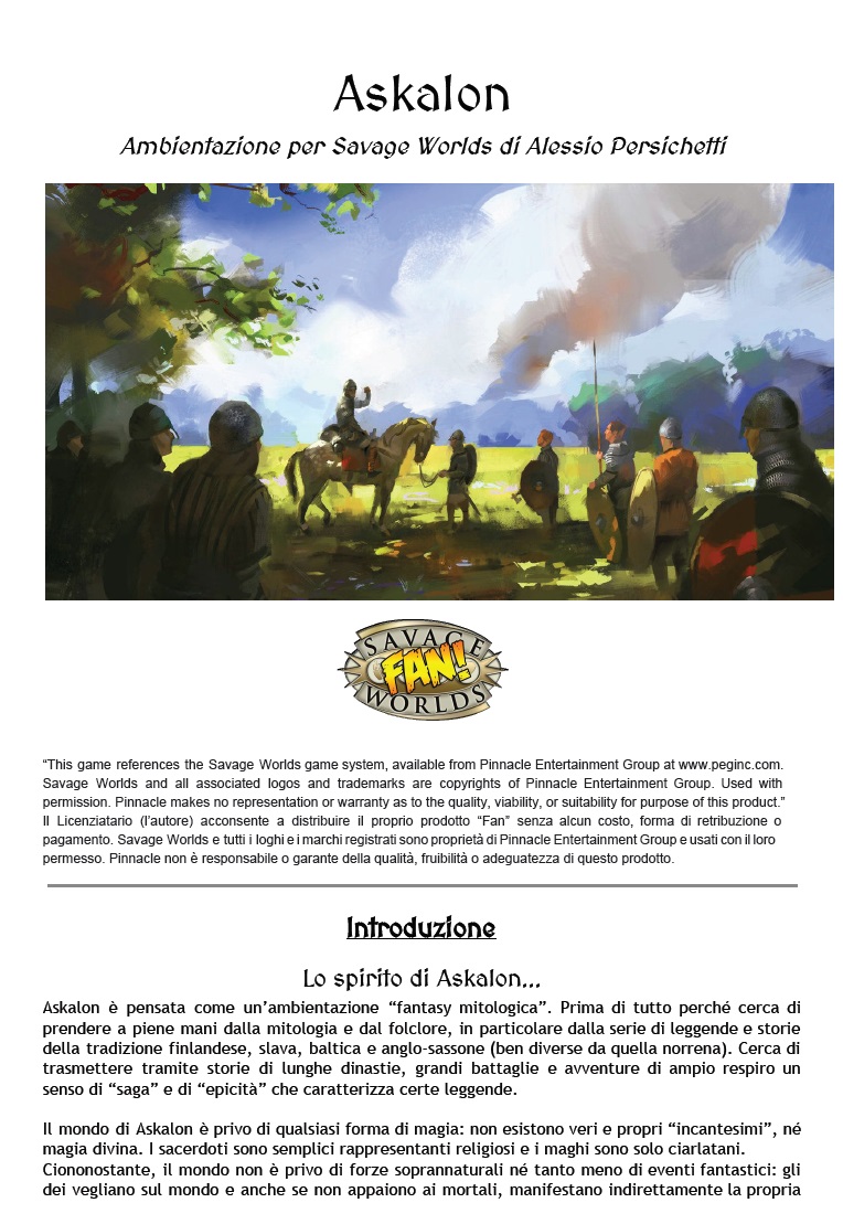 Askalon è un’ambientazione selvaggia per Savage Worlds con tanto di licenza e marchio “Fan”, che vi porta a scoprire un mondo ancora giovane e per la maggiorparte ancora inesplorato. Non c’è nessuna forma di magia, e questo potrebbe piacere ad alcuni ed essere un grosso impedimento per altri: effettivamente però il fantasy non è solo magia, potrebbe essere come in questo caso semplicemente sovrannaturale…